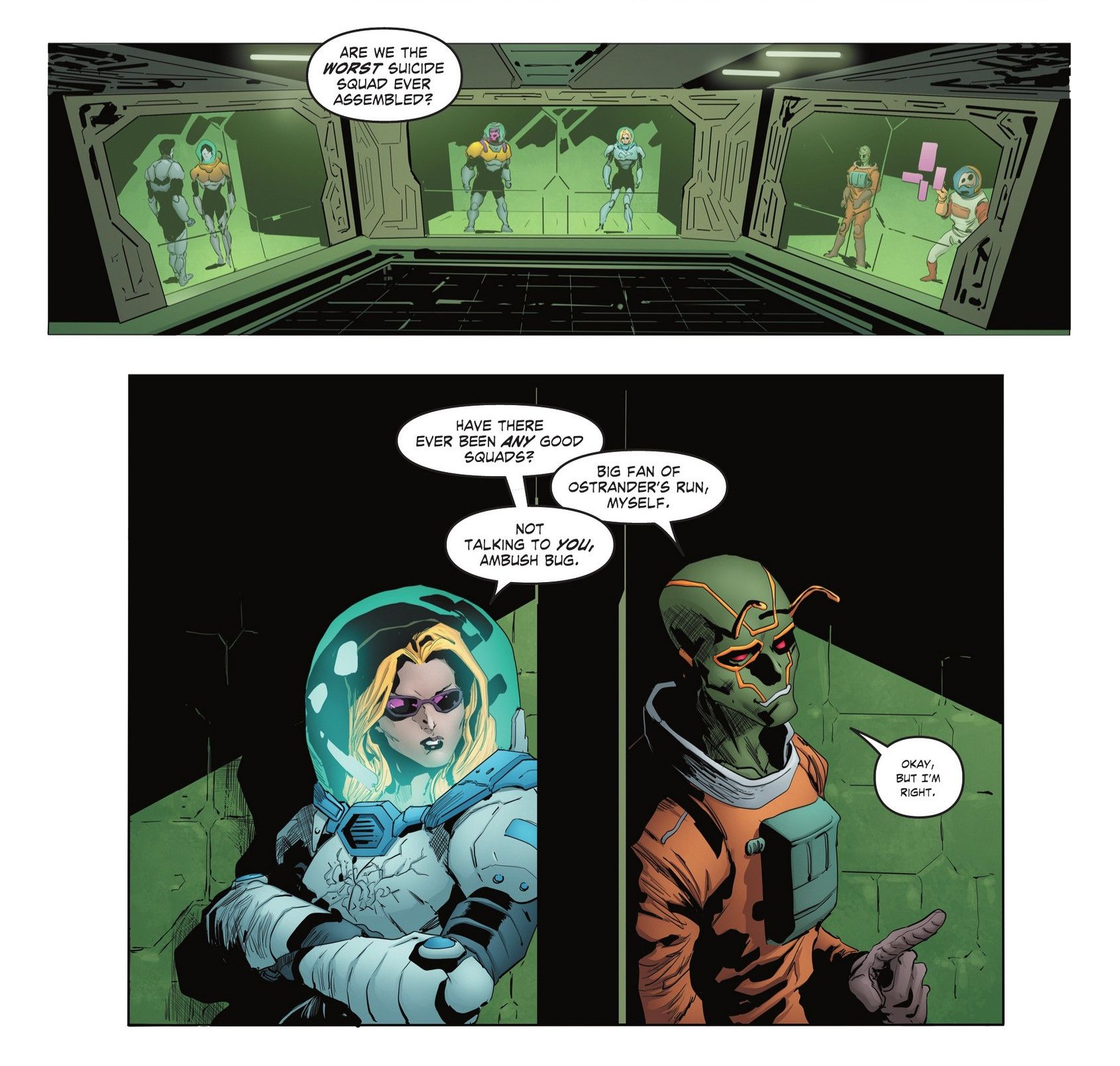 Waller has sent the Squad into deep space, only to be apprehended by the Green Lanterns. Once imprisoned in the Corps’ Sciencells, the team is tasked to retrieve the Black Hand, who has been a prisoner of the Corps. After being captured, the Black Canary of Earth-3 laments their situation, wondering if there has, “ever been any good Squads.” Ambush Bug (who regularly breaks the fourth wall) says he was a “big fan of Ostrander’s run.” The team has no idea what he is talking about.